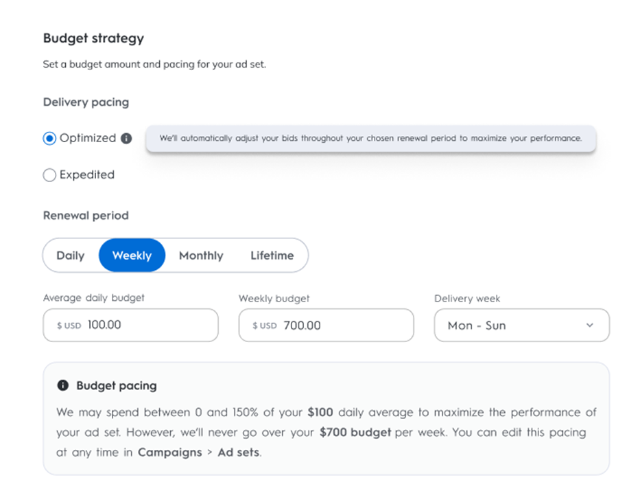 As you select your preferred Delivery pacing and renewal period, an information box will explain how your budget will be paced according to your selections.
