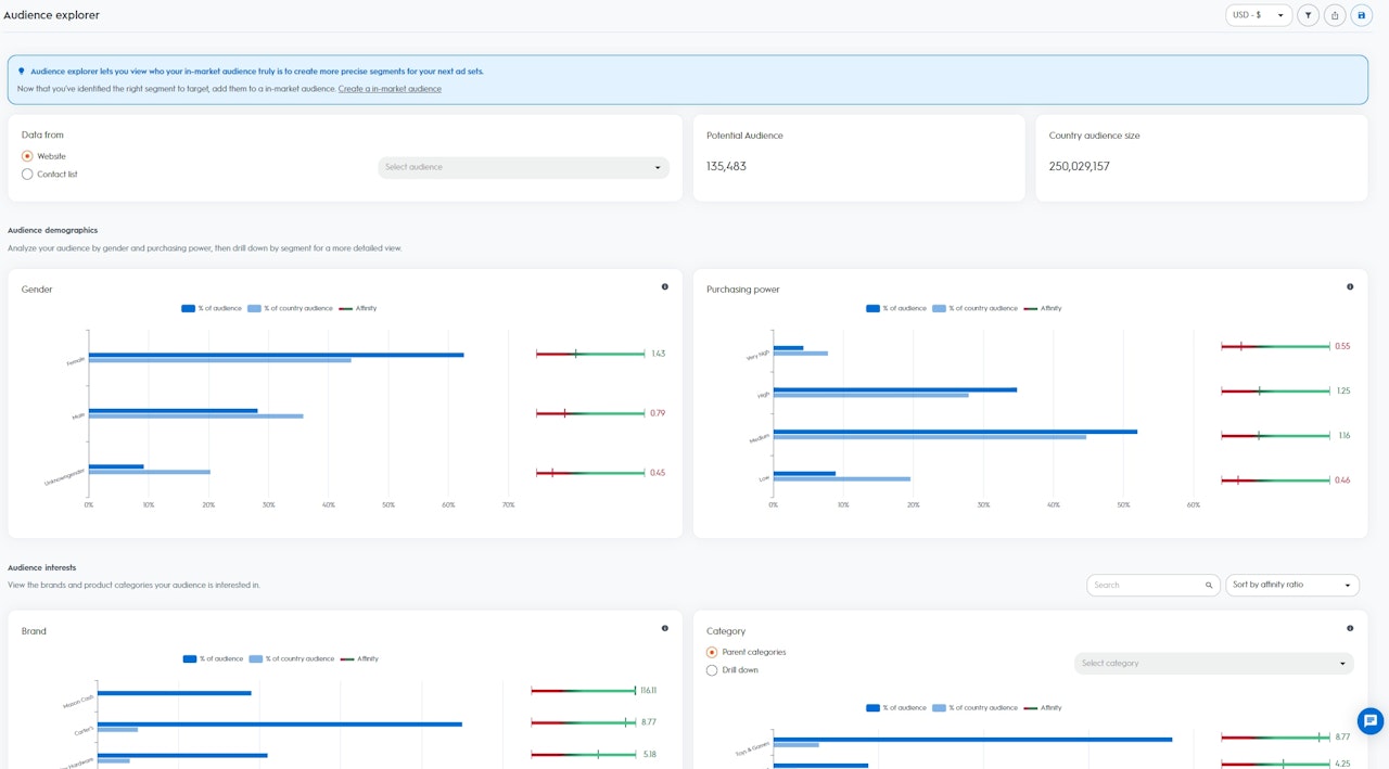 The Audience Explorer dashboard provides access to Criteo’s exclusive datasets. After selecting your preferred audience, you will gain insights into the categories and brands they prefer to buy across the Web.