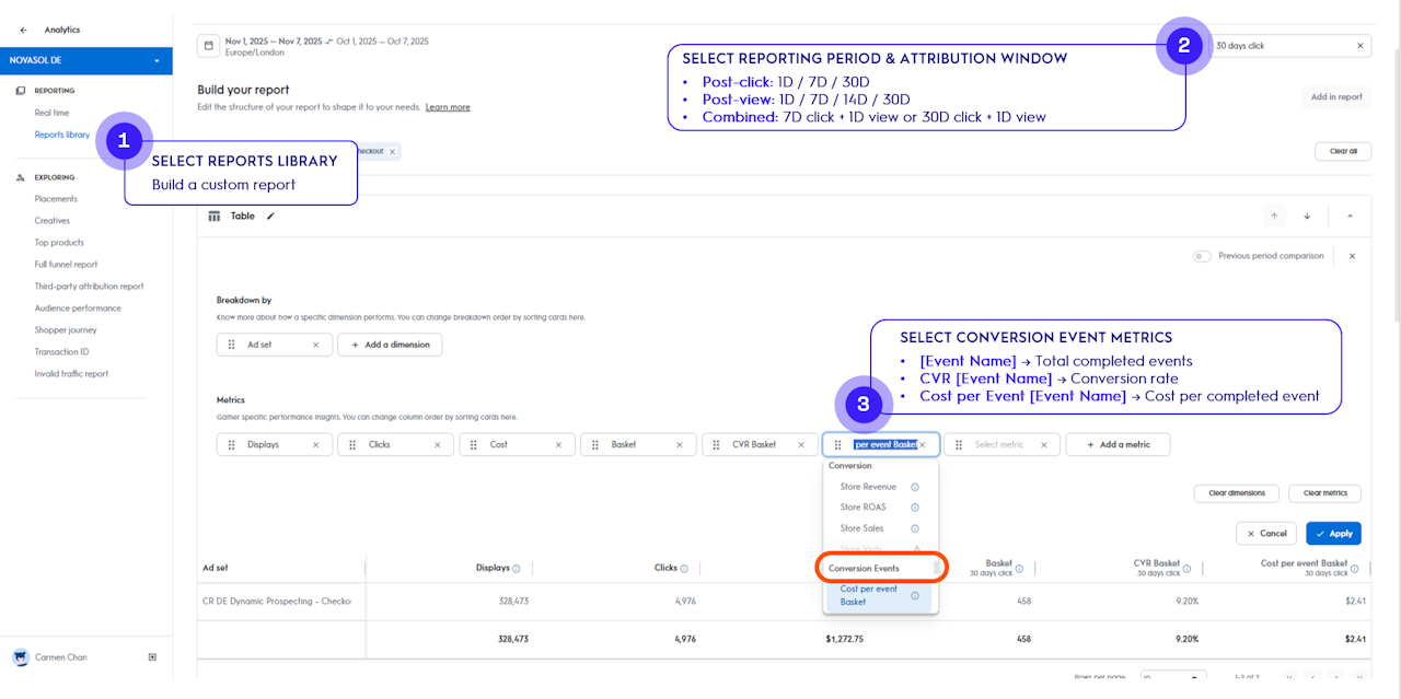 Choose the desired Conversion Events metrics and click Apply to pull your report