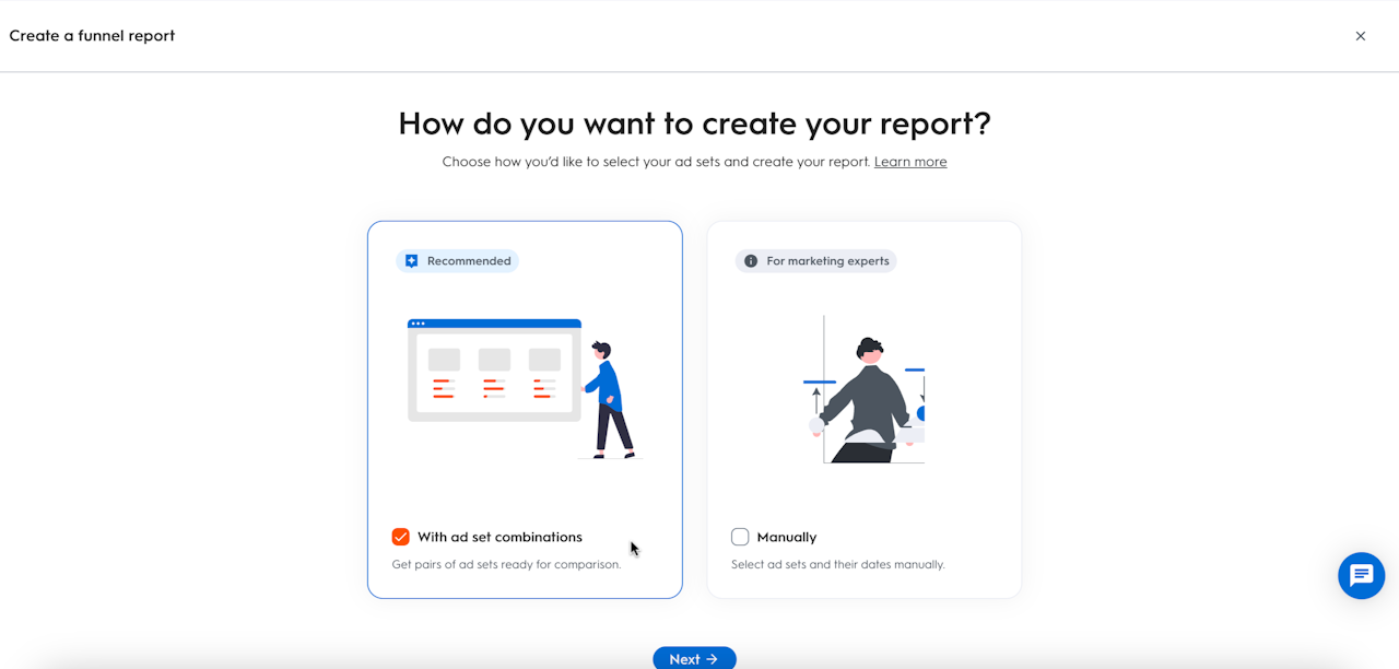 Choose how you would like to select your ad sets and create your report. You can choose between two options: