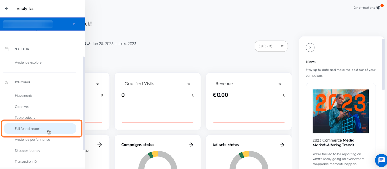 The Full funnel report is a dashboard available under the Analytics section in Commerce Growth.
