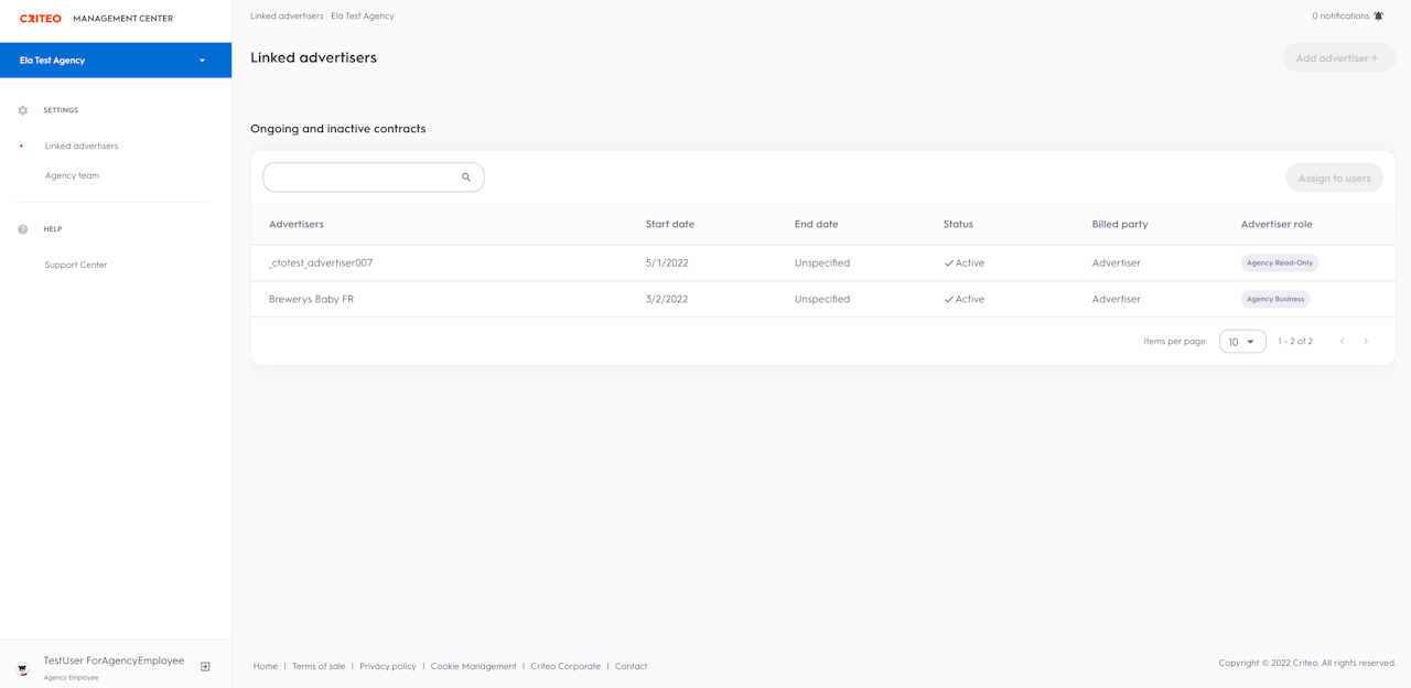 View the details of their ongoing contracts, such as start date, end date, status, billed party, the type of advertiser-level role assigned to them.