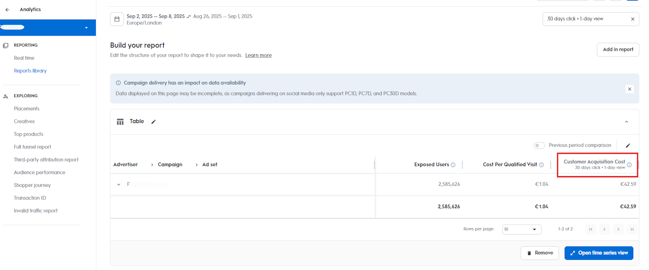 Customer Acquisition Cost is a new reporting metric added to custom reports. This metric shows the cost required to bring a first-time buyer to your brand. CAC is (Total Cost per campaign or ad set) divided by the Number of first-time buyers. First buyers are people who didn't buy on your website in the last 13 months. The data availability for calculating this metric starts from August 22, 2025.